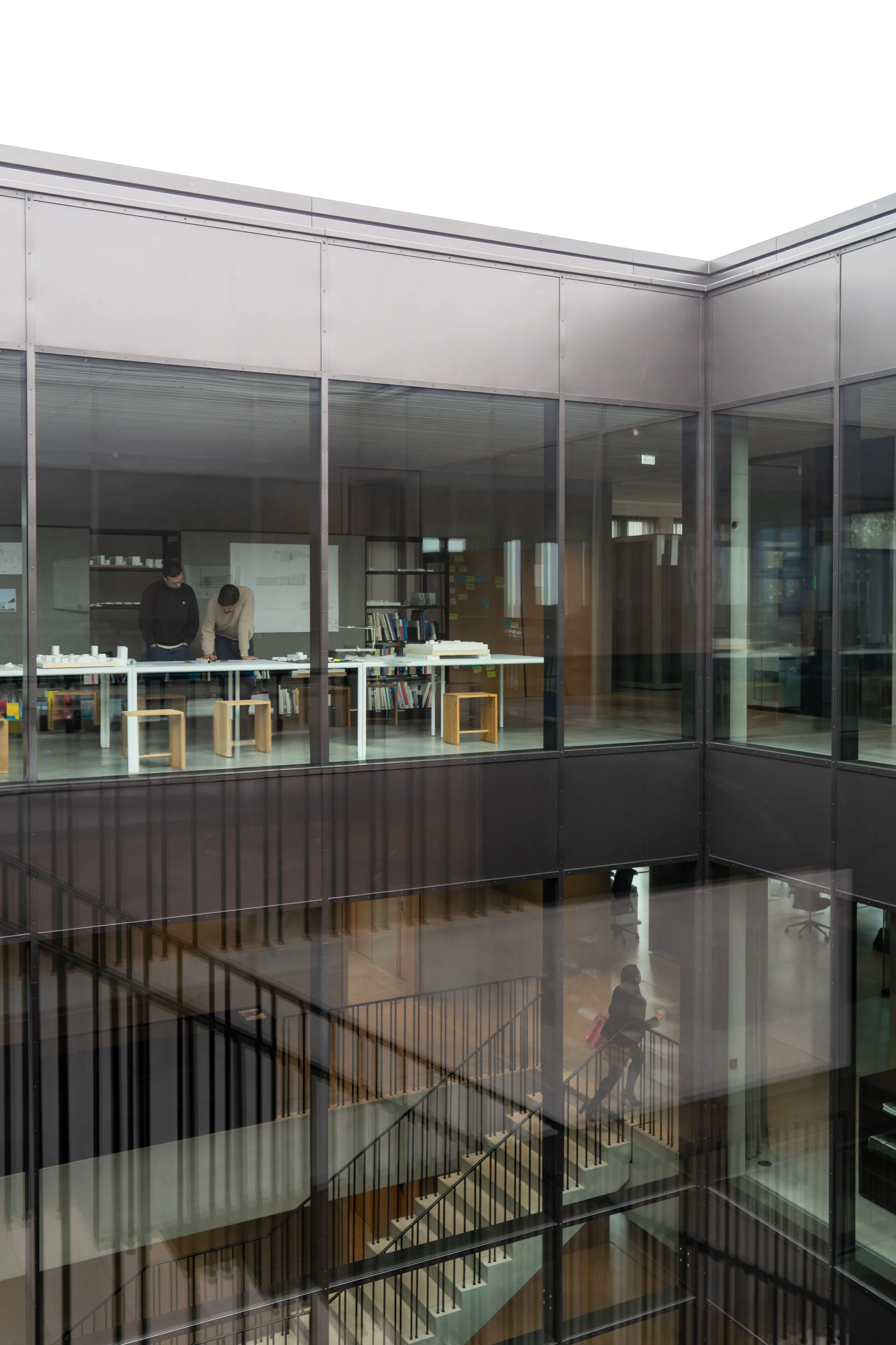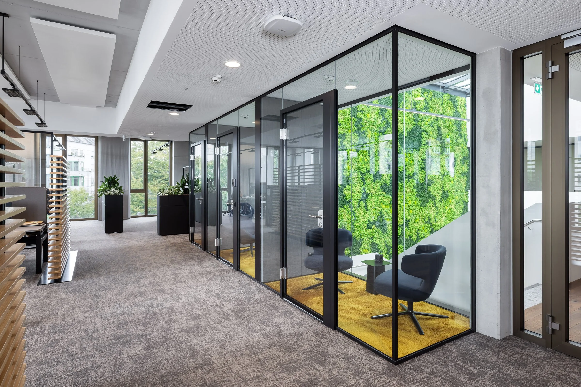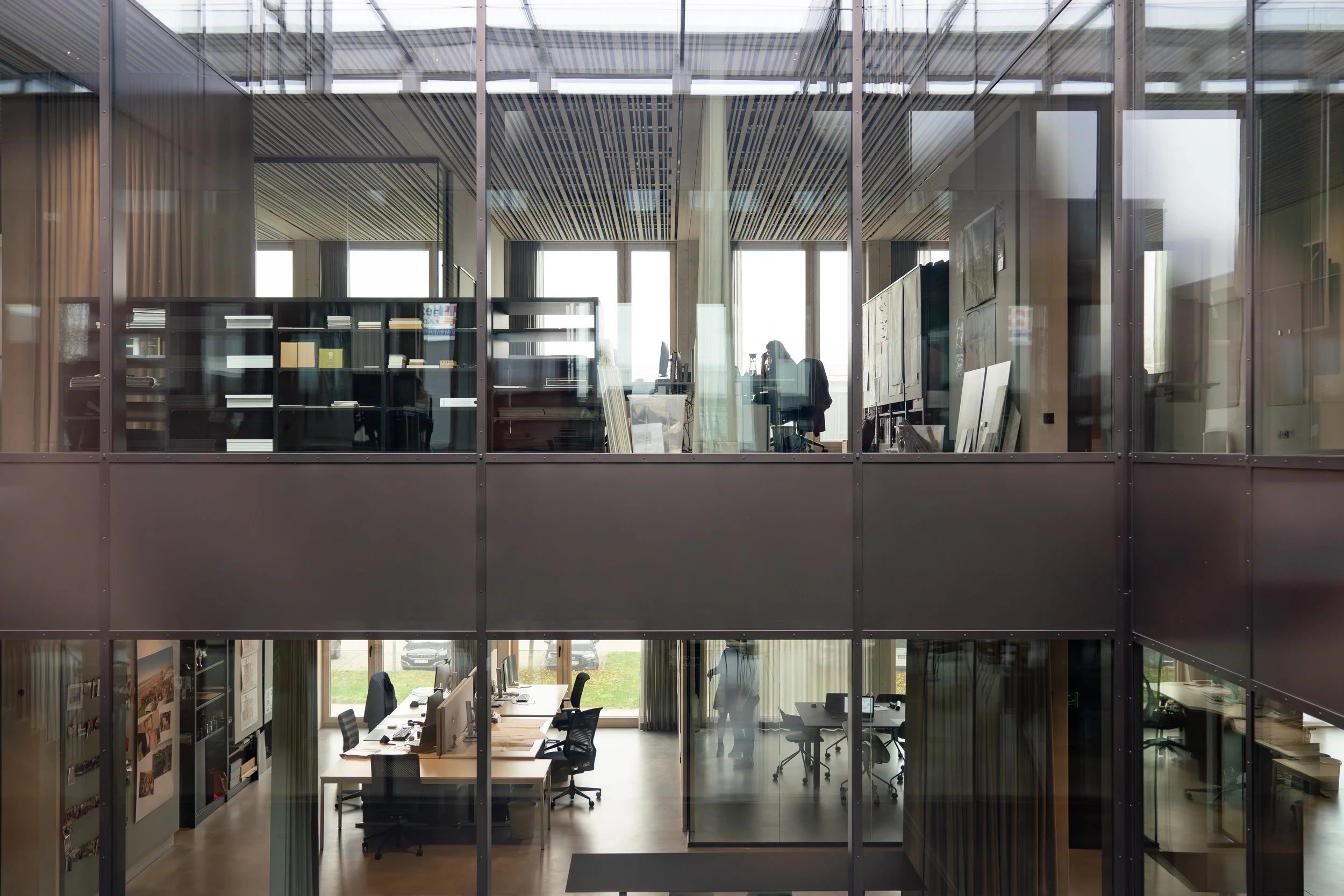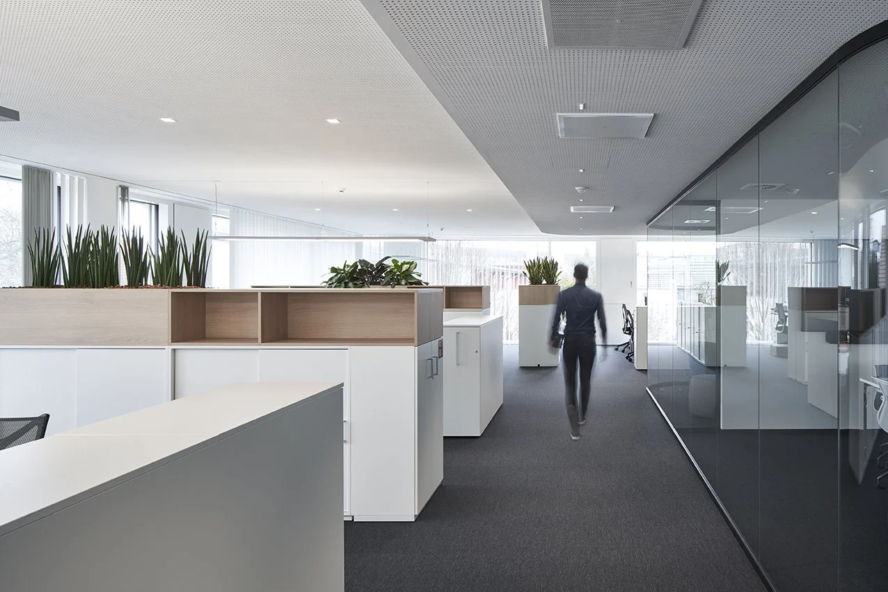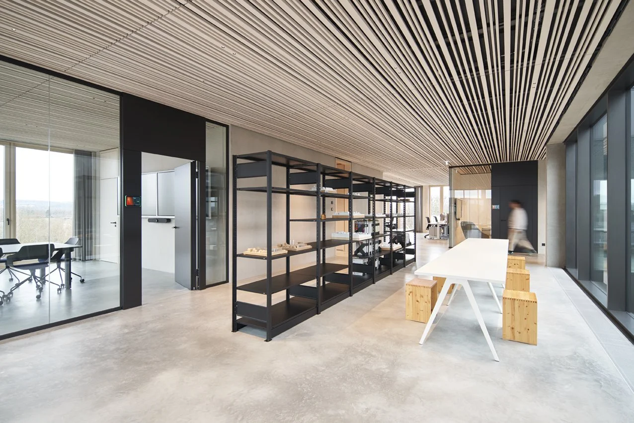 Durch Vorfertigung der Holzelemente wurde die Bauzeit auf 20 Monate reduziert – bei voller Kostenkontrolle. Innen haben wir bewusst auf geschlossene Einzelbüros verzichtet und eine offene Struktur geschaffen: durchlässige Arbeitsbereiche mit klaren Sichtbeziehungen, Begegnungszonen an zentralen Punkten. Das Ergebnis: mehr Kommunikation, kürzere Wege, schnellere Abstimmungen.