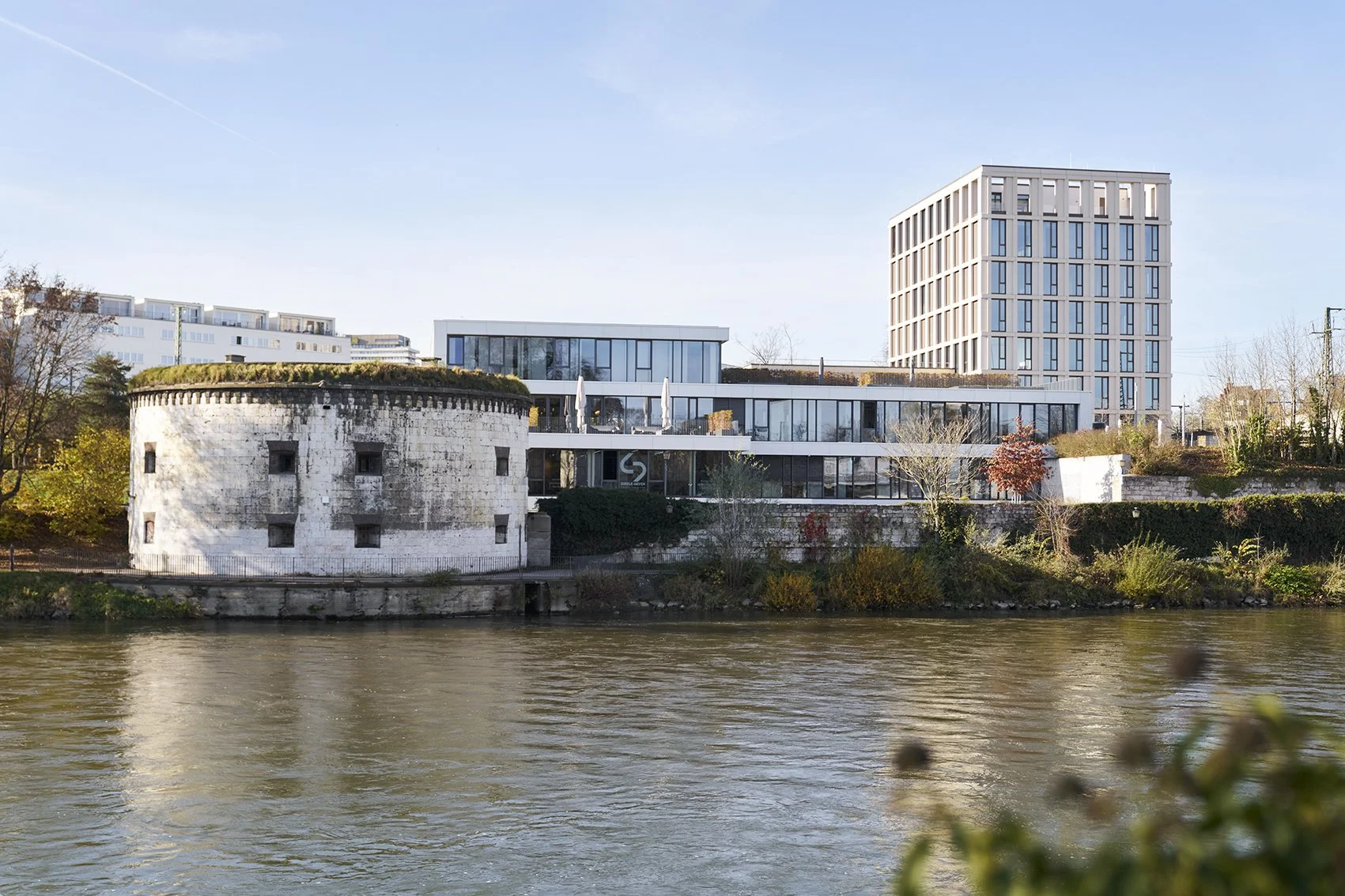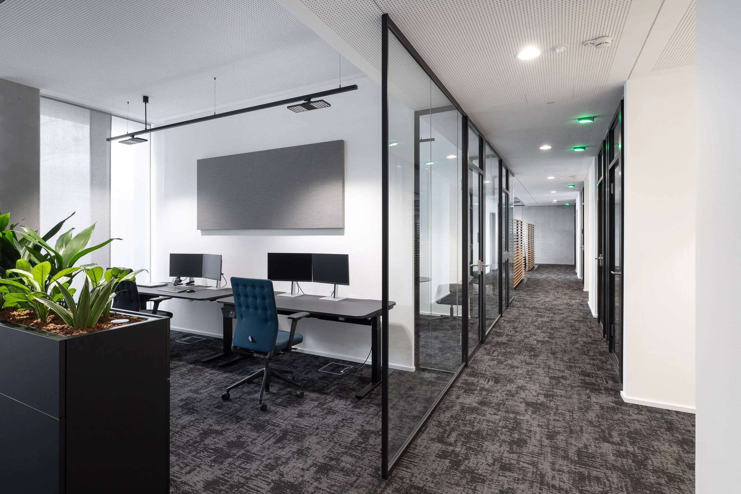 Das Ergebnis ist eine Arbeitswelt, die beides kann: konzentriertes Arbeiten in Einzelbüros und spontanen Austausch in offenen Begegnungszonen – von der Espressobar bis zur begrünten Dachterrasse. Nach außen transparent, nach innen diskret. Ein neuer städtebaulicher Akzent für Ulm, der die Identität der Kanzlei räumlich erlebbar macht.